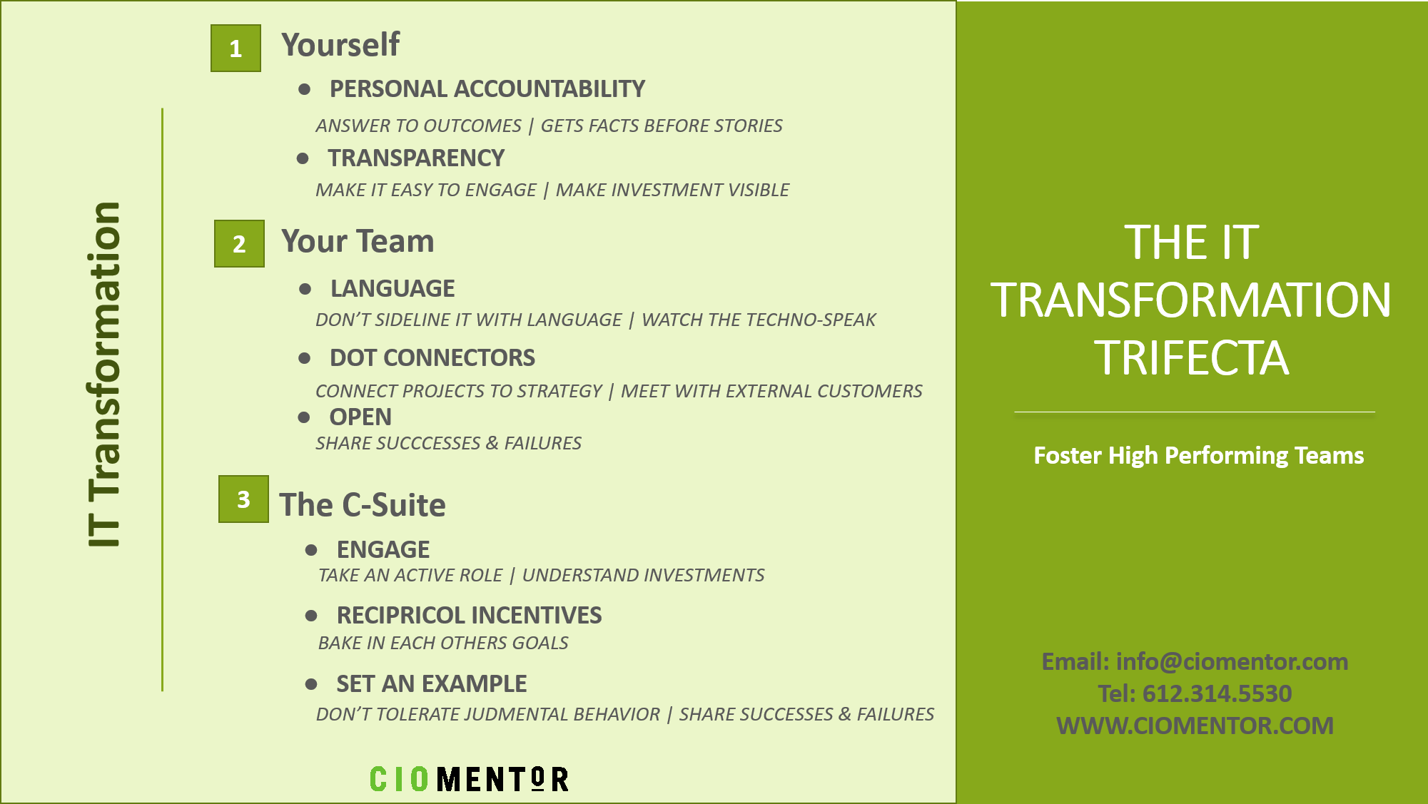 Personal accountability and IT transparency are fundamental to any transformational program. CIOs start the journey by establishing their ground game here.Personal Accountability. For IT to become a business peer, everything starts with you, the CIO. Adopt a philosophy of personal accountability where you answer to the outcomes of your choices and actions. When you encounter problems, resist the temptation to discuss the issue with everyone else at the watercooler and instead, take them straight to the people involved. Be the person known for gathering and then acting on facts rather than the office storyteller who only spins their wheels.